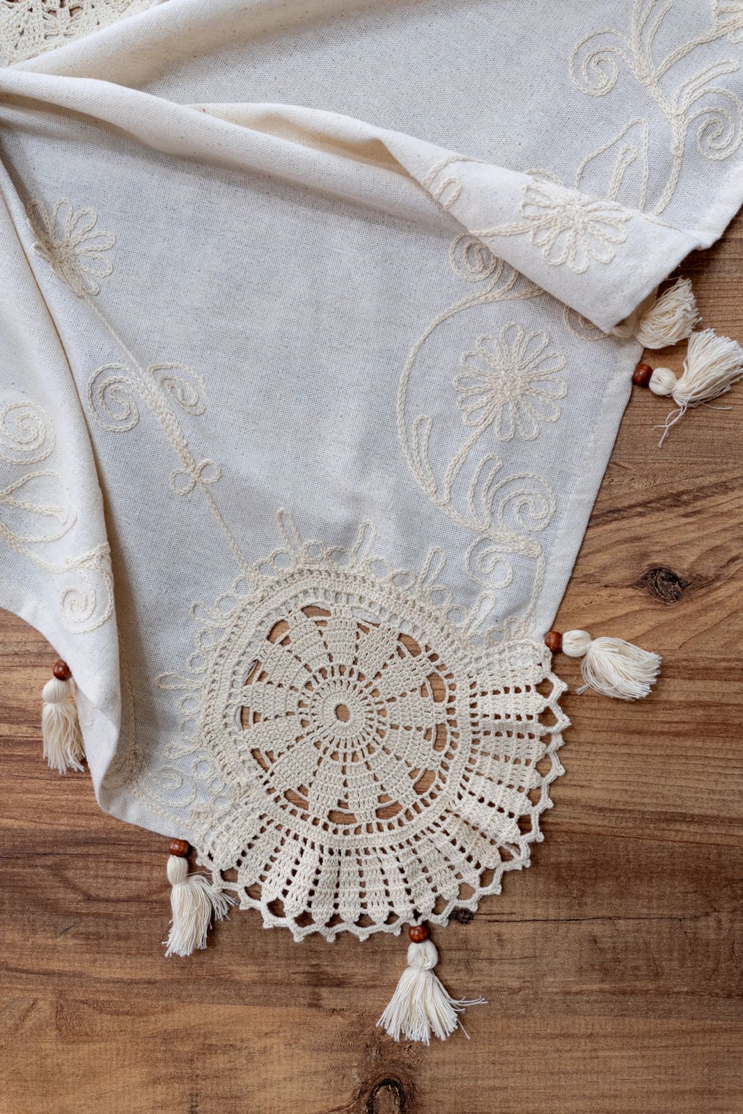 Krem Nakışlı Dantelli Keten Runner 130x130 cm