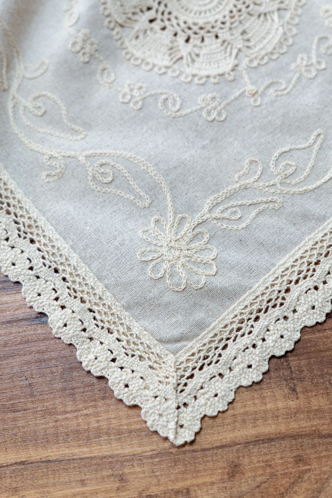 Krem Nakışlı Dantelli Keten Runner 45x45 cm
