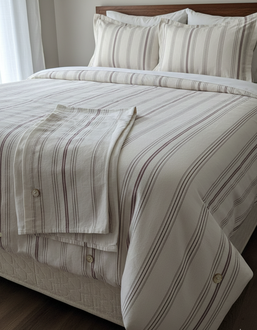 Çizgili keten nevresim ,2 adet yastık ve krem renk düz çarşaftan oluşmaktadır.